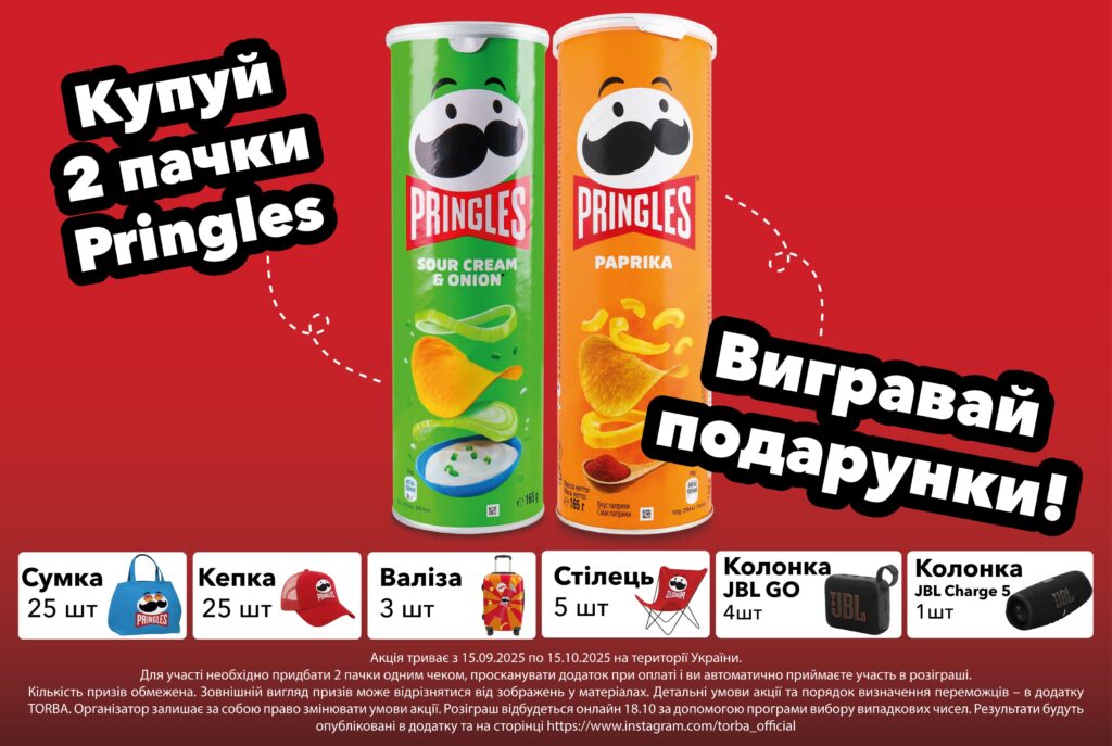 З 15 вересня до 15 жовтня 2025 року в магазинах діє акція від Pringles. Для участі достатньо придбати будь-які 2 пачки Pringles одним чеком, просканувати додаток під час оплати – і ви автоматично потрапляєте до розіграшу.